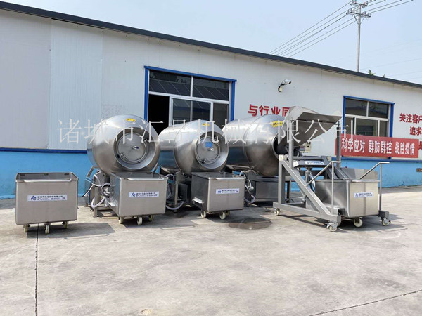 滾揉機(jī)是利用機(jī)械式滾筒原理,讓被腌制的肉互相摩擦,加快調(diào)味料深入食品內(nèi)的速度,從而起到加速腌制的作用,同時(shí),采用滾揉技術(shù)達(dá)到肉質(zhì)嫩化的效果也是西式火腿加工的重要工序,常規(guī)的滾揉機(jī)械加工過程中常常會(huì)因?yàn)闈L揉升溫而容易導(dǎo)致肉質(zhì)變質(zhì),因此滾揉的時(shí)間需要控制的十分好。真空滾揉機(jī)是為了彌補(bǔ)常規(guī)型滾揉機(jī)的缺點(diǎn)而進(jìn)行科學(xué)的設(shè)計(jì),真空狀態(tài)下可以很好的保證肉質(zhì)的質(zhì)量,在經(jīng)過微電腦控制滾揉時(shí)間,使得整個(gè)滾揉工藝變得簡單化和可快速復(fù)制性。